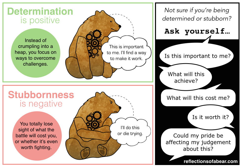 If determination is the willingness to overcome obstacles, I think stubbornness is pretending those obstacles don’t exist. It’s inflexibly sticking to your own ideas or desires even when that becomes a negative thing for you.